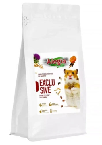 Alegia Exclusive Chomik 300 g to naturalna karma premium dla chomików. Zawiera mieszankę zbóż, nasion i warzyw bogatych w witaminy i minerały. Wspiera odporność, energię i naturalne ścieranie zębów. To pełnowartościowa i zdrowa dieta codzienna.