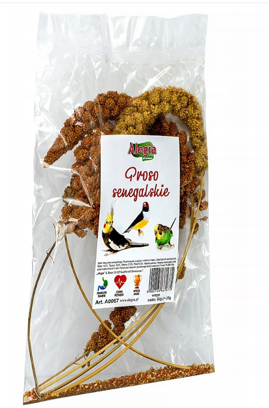 Proso Senegalskie 80g stanowi bardzo dobre uzupełnienie diety ptaków i gryzoni oraz zapewnia im rozrywkę, poprzez wyskubywanie ziaren z kłosów. Stanowi bogate źródło sodu, potasu, wapnia, magnezu, soli mineralnych oraz witamin A i B.