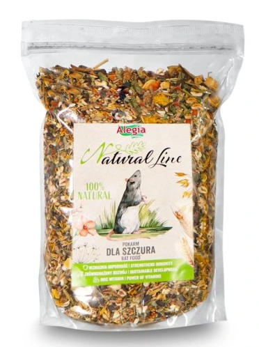 Skład: proso żółte, owies, pszenica, proso czerwone, kukurydza prasowana, jęczmień, groch gnieciony, gryka, krokosz kardi, płatki jęczmienne, nasiona słonecznika czarne, chleb świętojański, kwiat nagietka, nasiona rajgrasu, sorgo czerwone, pietruszka, sorgo białe, ostropest plamisty, nasiona kopru, babka lancetowata, mącznik młynarek, jabłko kostka, koper łodyga, pszenica dmuchana, nasiona konopi, jabłko chips, pestki dyni, marchewka kostka, mięta, pasternak kostka, marchew chips, stinte.