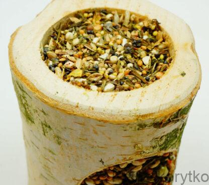 Skład: proso, rzepak, rzepik, ryż biały, dari, pietruszka, siemię lniane, owies łuskany, kardi, nasiona konopi, ryż dziki, gryka, murzynek, nasiona traw, kukurydza, pszenica, owies łuskany, sorgo czerwone, peluszka zielona, groch żółty i zielony, peluszka brązowa, słonecznik czarny i prążkowany, skrobia. Produkt dla: myszy, szczurów, chomików, myszoskoczków. Wymiary: wysokość 10 cm, średnica ok. 7 cm, średnica otworu: 5 cm. Waga netto (pokarm): min. 110 g Waga brutto: ok. 270 g Kod producenta: Hs.03A Kod EAN: 5907222880067 Opakowanie: folia termokurczliwa, kolorowa etykieta.